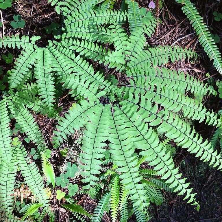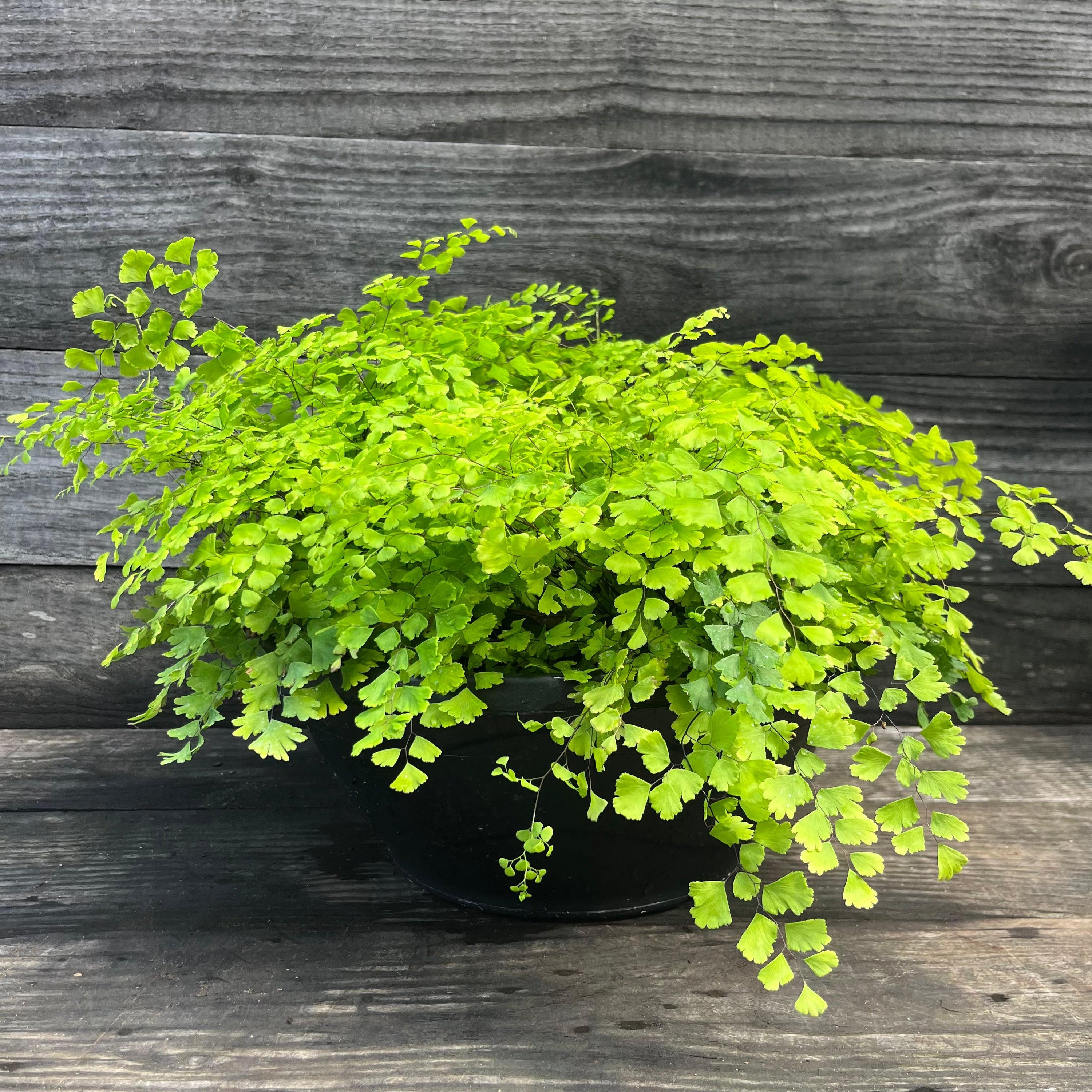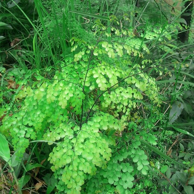 Hardy Maidenhair Fern is a popular hardy evergreen fern with distinctive fan-shaped, lacy bright green fronds on shiny black curved stems. Grows best in full shade and moist, acidic well-drained soils. Resistant to verticillium wilt.
